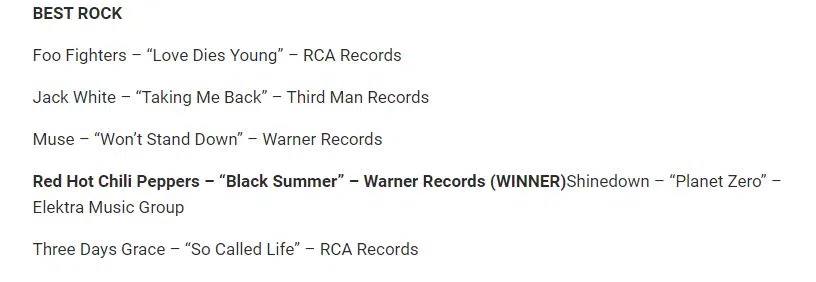 "Black Summer" by Red Hot Chili Peppers is your #VMA Best Rock winner! pic.twitter.com/O2prTUHySk