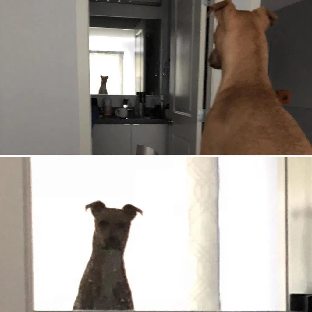 You’re supposed to break up blogs with photos every few paragraphs, but I don’t have any photos from the date – so here’s a photo of my dog looking at herself in the mirror.