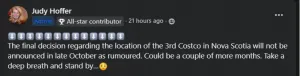 “The final decision regarding the location of the 3rd Costco in Nova Scotia will not be announced in late October as rumoured. Could be a couple of more months. Take a deep breath and stand by…